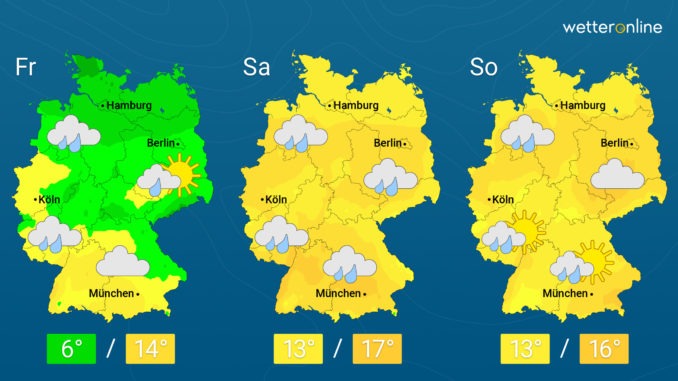 In der Nacht zum Samstag kühlt es kaum ab und tagsüber steigen die Temperaturen auf sehr milde 13 bis 17 Grad. Dabei ziehen weitere Regenwolken durch, nur im äußersten Süden regnet es kaum und in Alpennähe lässt sich auch mal die Sonne blicken. Dazu weht ein lebhafter, im Südwesten auch starker Wind.