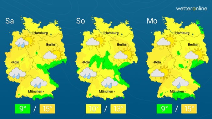 Am Sonntag ziehen von Westen her neue ergiebige Regenfälle auf. Bis zum Abend wird es auf einem Streifen vom Emsland bis nach Oberbayern nass. Richtung Nordosten bleibt es dagegen meist trocken und auch die Sonne trägt zum freundlichen Ausflugswetter bei. Die Temperaturen liegen bei rund 10 Grad im Rhein-Main-Gebiet, im Norden bei 13 Grad.