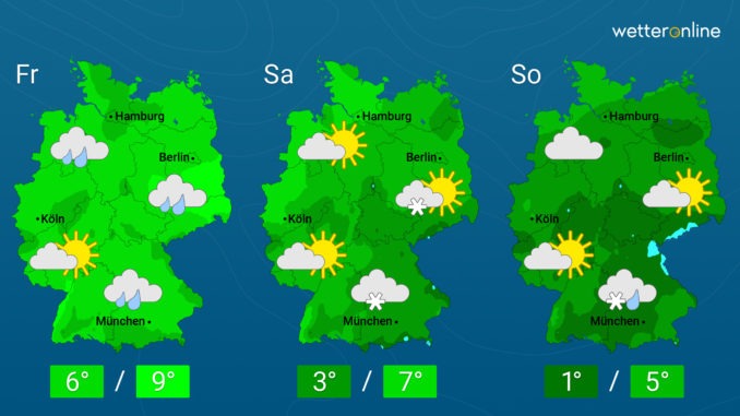 Am Freitag zieht eine Kaltfront von Norden nach Süden. Besonders von Baden-Württemberg bis Bayern kann es den ganzen Tag über regnen. Im übrigen Land lockert es nach Durchzug der Kaltfront auf und es wird teils richtig sonnig. Jedoch kann es hier und da noch Schauer geben, bei denen sogar bis ins Flachland nasse Schneeflocken möglich sind. Im Alpenvorland geht der Regen gegen Abend in Schnee über. Im Nordosten erreichen die Höchstwerte 5 Grad, im Süden sind es eher 8 Grad.