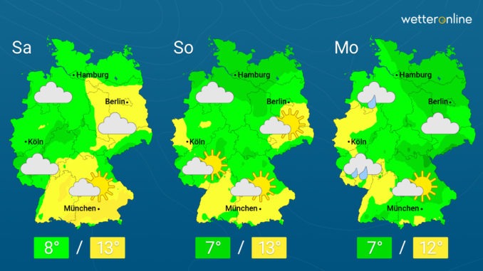 Der Samstag beginnt vielfach mit dichten Nebelfeldern. Die sonnigen Abschnitte nehmen im Laufe des Tages zu. Am freundlichsten wird es dabei in Süddeutschland. Dort sind sogar bis zu acht Stunden Sonne möglich. Ansonsten bleibt es dicht bewölkt, aber trocken. Verbreitet zeigt das Thermometer am Nachmittag um 10 Grad an, im Süden sind bei Föhn sogar bis zu 14 Grad möglich.