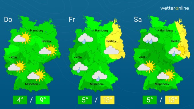 Am Freitag sind deutlich mehr Wolken am Himmel. Aus den Alpen zieht ein Niederschlagsgebiet langsam Richtung Norden. Vom Allgäu bis in die Landesmitte wird es im Tagesverlauf gelegentlich nass. In den Mittelgebirgen können regional ein paar Flocken fallen. Im großen Rest bleibt es zwar dicht bewölkt, aber meist trocken. Die größten Chancen auf etwas Sonne gibt es im Raum Berlin. Mit Höchstwerten zwischen 5 und 14 Grad wird es etwas milder. An den Küsten frischt der Wind stürmisch auf.