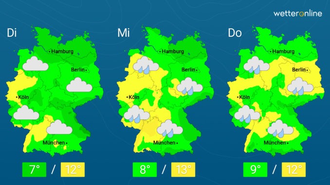 Am Dienstag ist der Himmel in den meisten Landesteilen grau. Besonders am Vormittag kann es dazu fast überall ein wenig regnen. Generell ist die Wahrscheinlichkeit im Norden aber höher als im Süden. Im Südwesten lockern die Wolken im Tagesverlauf etwas auf und die Sonne zeigt sich. Am Abend ziehen aus Richtung Benelux neue Regenwolken auf und der Wind legt deutlich zu. Die Höchstwerte erreichen 7 Grad an der Ostsee und bis zu 12 Grad im Oberrhein.