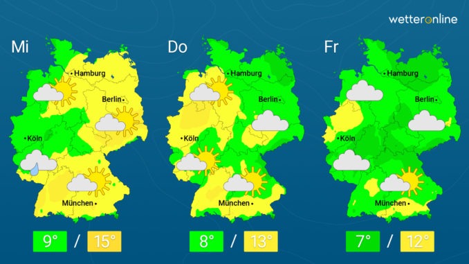 Am Mittwoch ist es in einem Streifen von der Pfalz bis zur Lausitz trüb und gelegentlich fällt etwas Regen. Sonst teilen sich nach Nebelauflösung Sonne und lockere Wolkenfelder den Himmel und es bleibt trocken. Die Höchstwerte liegen zwischen 7 Grad an der Nordsee und bis zu 14 Grad am Oberrhein. Bei Föhn sind auch wieder Werte über 15 Grad drin.