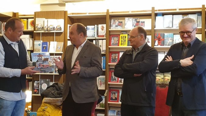 Heute übergab Josef Klug – seit 1989 bei der Berufsfeuerwehr Nürnberg – in der Buchhandlung Pelzner das Buch „Fahrzeuge der Feuerwehr Nürnberg“ an Bürgermeister Christian Vogel und Stadtdirektor Volker Skrok.
