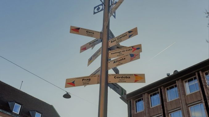 In diesem Jahr steht erstmals ein Schilderbaum auf dem Markt, der die Richtung und Entfernung zu der jeweiligen Partnerstadt anzeigt. Ein langwieriges Projekt, das mehrere Jahre gedauert hat. Gefertigt haben ihn Berufsschüler für Metallbau der Berufsschule B2.