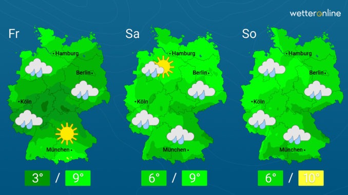 Am Freitag erreicht eine Kaltfront mit Regen schon morgens den Nordwesten Deutschlands. Die Niederschläge breiten sich langsam südostwärts aus. Vorsicht: Auf noch gefrorenem Boden kann sich Glatteis bilden. In der Südosthälfte bleibt es bis zum Abend trocken, dort scheint auch oft die Sonne. Nur in Gewässernähe und Muldenlagen ist es durch Nebel und Hochnebel oft länger trüb. Dementsprechend sind hier kaum mehr als 2 Grad drin. Ansonsten zeigt das Thermometer 4 bis 10 Grad an. Der Wind frischt böig auf.