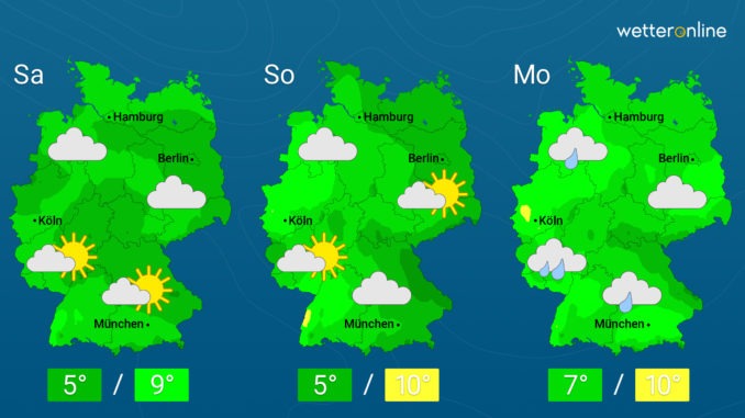 Am Samstag ist der Himmel im Norden meist grau durch Hochnebel. Von den Mittelgebirgen weiter südwärts wechseln sich Hochnebel, Nebel und Sonne ab. Die Chancen auf längere freundliche Abschnitte sind dabei im Bergland am größten. Strahlend schön wird es auch in den Alpen. Abseits vom Nebel sind dabei Höchstwerte bis zu 9 Grad möglich, im Dauergrau bleibt es deutlich kälter. Bei ganztägigem Nebel zeigt das Thermometer kaum 0 Grad an.