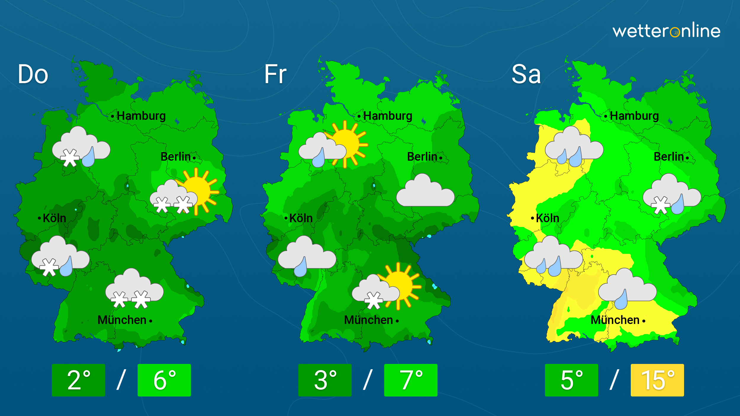 Am Aschermittwoch zieht ein kleines Tief mit kräftigen Niederschlägen durch. Im ganzen Land sind Regen-, Schneeregen- oder Schneeschauer möglich. Dabei kann es besonders im Westen und in der Landesmitte auch im Flachland vorübergehend mal weiß werden. In den Mittelgebirgen fallen regional 10 Zentimeter Neuschnee und mehr. Die Straßen werden in den Morgenstunden glatt. Dazu weht in der Südhälfte ein frischer bis stürmischer Wind, wodurch in freien Hochlagen Schneeverwehungen möglich sind. Die Höchstwerte erreichen meist 2 bis 6 Grad.