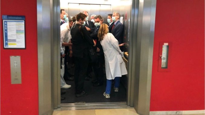 Wie bekommt man die Politiker Bouffier, Spahn, Klose, Braun und Bußer während der Corona-Zeit in einen Aufzug? Man macht die Tür auf.“ So kommentiert die „hessenschau“ ein Bild, das Jens Spahn und Kollegen des Gesundheitsministers auf engstem Raum in einem Fahrstuhl zeigt.