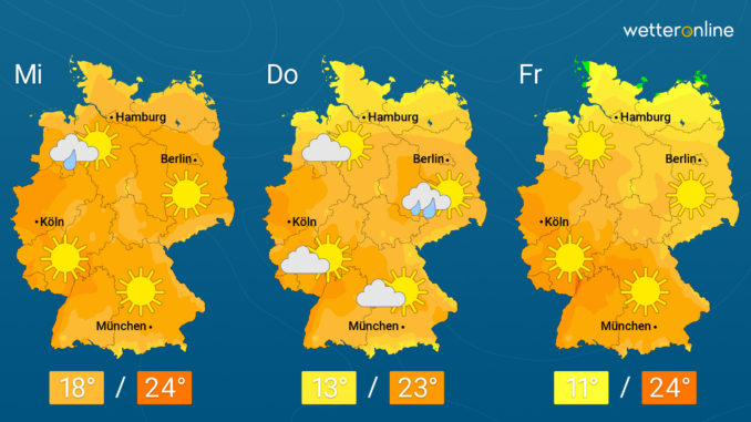 Am Mittwoch scheint die Sonne fast überall wieder von früh bis spät von einem meist strahlend blauen Himmel. Im Westen und Süden sind bis zu 13 Sonnenstunden möglich. Nur im Küstenumfeld ziehen ein paar harmlose Wolken durch. Die Temperaturen steigen noch etwas an und erreichen Höchstwerte zwischen 19 Grad an den Küsten und 24 Grad entlang des Rheins.