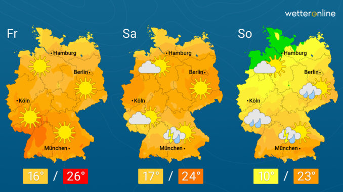 Hoch PAUL beschert uns zunächst noch ruhiges und warmes Frühlingswetter. Dabei geht es im Südwesten auf 26 Grad hinauf. Ab Samstag steigt das Schauer- und Gewitterrisiko an. Zum Wochenstart wird es von Norden her spürbar kälter.