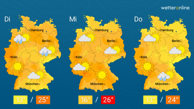 Am Mittwoch fließt im Norden wieder etwas kühlere Luft ein. Dazu scheint die Sonne meist für viele Stunden, nur an der Elbe und am Bayerischen Wald sind auch mal einige Wolken dabei. Abgesehen von einzelnen Tropfen bleibt es trocken. Die Temperaturen liegen zwischen 15 Grad an der Ostsee und 27 Grad im Rhein-Main-Gebiet.