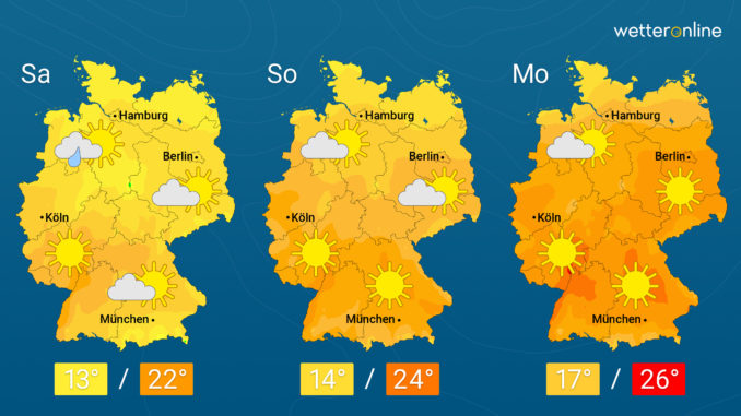 Zum Start in die neue Woche steigen die Temperaturen noch etwas an. Dazu gibt es weiter viel Sonnenschein, regional kann es aber auch mal etwas wolkiger sein und vor allem zur Ostsee hin sind immer noch und Richtung Bayern wieder ein paar Regenschauer dabei.