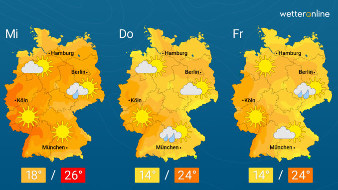 Der Mittwoch beginnt in den meisten Landesteilen mit viel Sonnenschein. Nur Richtung Nordosten ist es gebietsweise etwas wolkiger. Im weiteren Tagesverlauf bilden sich in der gesamten Nordhälfte vermehrt Wolken. Vom Niederrhein bis zum Bayerischen-Wald sowie südlich davon bleibt es sonnig. Die Höchstwerte erreichen 18 Grad an der Nord- und Ostsee. Am Rhein sind sommerliche Werte um 25 Grad möglich.