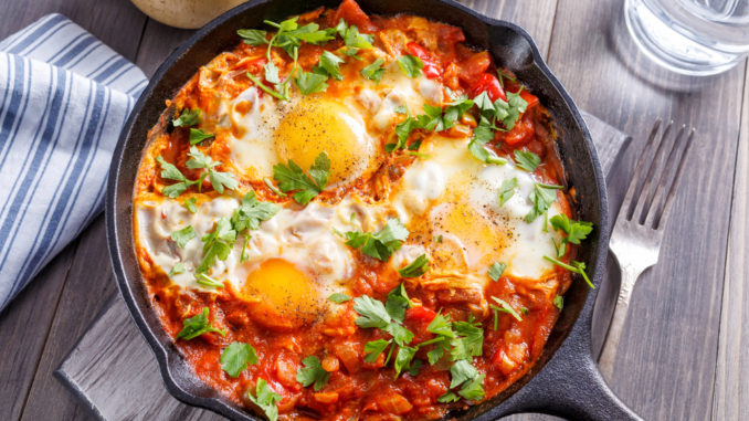 Zutaten für vier Personen: 4 EL Olivenöl, 4 Knoblauchzehen, 1 Zwiebel, 850 ml passierte Tomaten aus der Dose, 1 EL edelsüßes Paprikapulver, 2 EL Tomatenmark, 1 TL Chilipulver, Salz, Pfeffer, 1 TL Kreuzkümmel, 4 Eier, 1 Bund Koriander