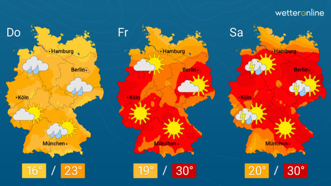 Nach einem noch meist trüben und mäßig warmen Donnerstag geht es mit den Temperaturen steil bergauf. Am Wochenende entladen sich dann teils heftige Gewitter, örtlich sind auch Unwetter mit Starkregen und Hagel möglich.