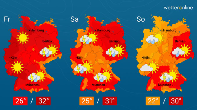 Der Freitag beginnt fast überall sonnig und wird mit Höchstwerten von meist 27 bis 33 Grad verbreitet schweißtreibend. Im Osten Deutschlands sowie vom Alpenrand bis in die südwestlichen Mittelgebirge bilden sich jedoch vermehrt Quellwolken, die sich zu Schauern und Gewittern ausbauen können. Örtlich sind diese schon kräftig. Im Rest des Landes bleibt es trocken und Wolken sind meist harmlos. Am sonnigsten wird es vom Münsterland bis nach Nordfriesland.
