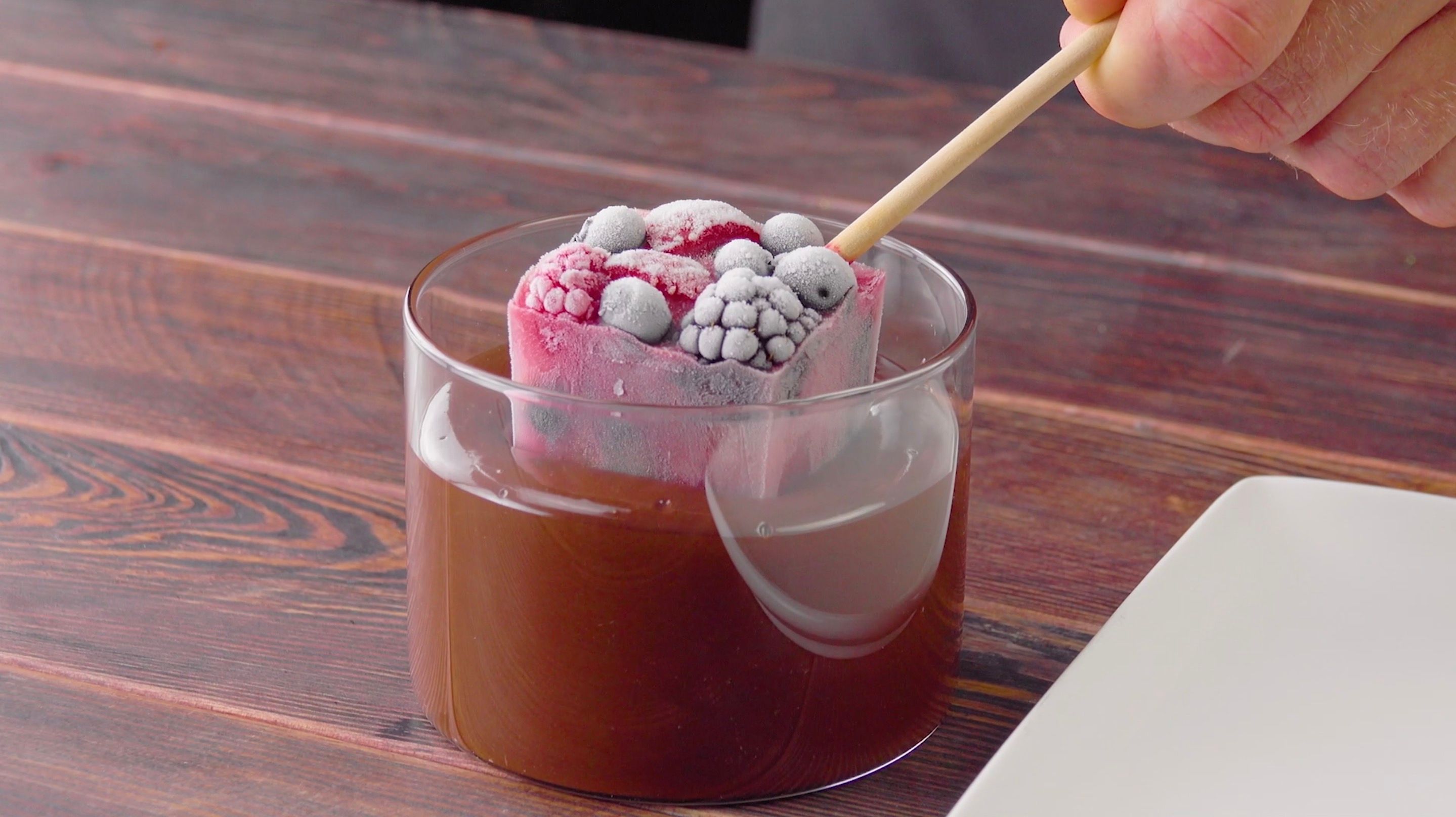 8.) Löse den Eiswürfel nun vom Stiel, übergieße ihn mit Zuckersirup und püriere das Ganze.
