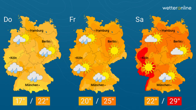 Am Wochenende werden verbreitet Temperaturen um 25 Grad erreicht, nur an den Küsten und bei Schauern ist es etwas kühler. Zunächst gibt es besonders im Südosten noch einige Spritzer Regen, am Sonntag kommen voraussichtlich in der Nordhälfte Schauer und einzelne Gewitter auf.