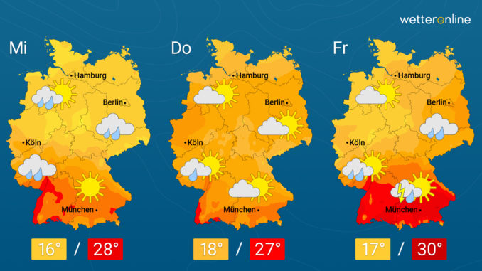 Der Freitag bringt im Süden zunächst Sonne und es wird bis zu 30 Grad heiß. Dann folgen teils kräftige Gewitter mit Unwetterpotential und die Temperaturen gehen deutlich zurück. Sonst ist es wechselhaft mit einzelnen Schauern und kühl. Auch am Wochenende ist es noch leicht wechselhaft, im Süden wird es jedoch schon freundlicher und die Temperaturen steigen wieder an