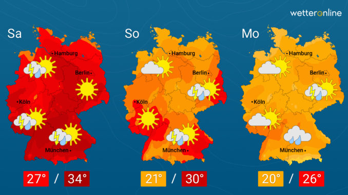 Am Samstag beginnt der Tag für die meisten trocken, sonnig und warm. In der Westhälfte breiten sich teils dickere Wolken weiter nach Osten aus. Örtlich können sich bereits Schauer und Gewitter bilden. Am Nachmittag steigt das Gewitterrisiko dort weiter an, sodass es vermehrt zu Gewittergüssen mit Starkregen, Hagel und Sturmböen kommt. Punktuell sind auch Unwetter mit großen Regenmengen möglich. Im weiteren Verlauf ziehen diese weiter nach Osten. Vor den Gewittern wird es schwül-heiß mit Werten zwischen 27 und 35 Grad, örtlich auch darüber.