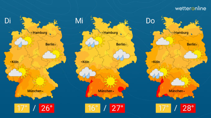 Die Wetterunterschiede zwischen Nord und Süd nehmen zu: Während an der Nordsee schon am Dienstag neue Regenwolken aufziehen, herrscht im Süden oft strahlender Sonnenschein und es wird sommerlich warm. Erst zum Freitag bringen Gewitter auch dort wieder Abkühlung.