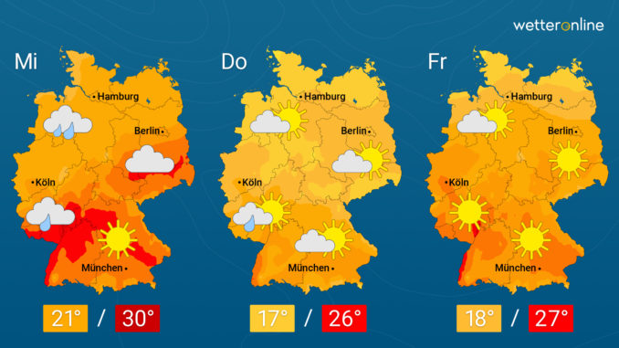 Am Mittwoch schieben sich dichtere Wolken aus der Nordwesthälfte weiter in Richtung Landesmitte. Aus ihnen fällt vor allem von der Ostsee bis zum Emsland zeitweise etwas Regen. Besonders entlang der Küsten lebt der Wind erneut böig auf. Im Süden und Südosten Deutschlands scheint dagegen viele Stunden lang die Sonne. Dort liegen die Höchstwerte bei 25 bis 29 Grad, unter den Wolken im Norden und Westen bei 20 bis 23 Grad.