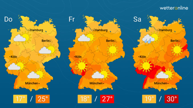 Am Freitag scheint in der breiten Mitte die Sonne. In den nördlichen Landesteilen können ein paar Wolkenfelder durchziehen, dort bleibt es aber trocken. Im Süden verläuft der Tag nach Auflösung einzelner Nebelfelder freundlich. Allerdings bilden sich im Tagesverlauf ein paar Quellwolken. Nur in den Alpen können diese ganz vereinzelt zu einem kurzen Schauer oder Gewitter heranwachsen. Am wärmsten wird es im Westen und Südwesten mit Höchstwerten zwischen 24 und 27 Grad. In den anderen Landesteilen zeigt das Thermometer 18 bis 23 Grad an.