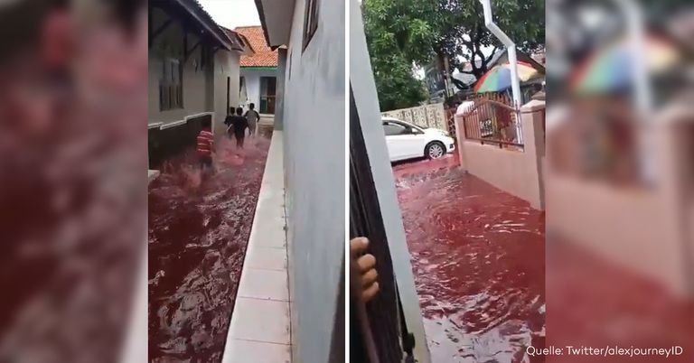 Wasser, blutrot gefärbt, überschwemmt das kleine indonesische Dorf Jenggot. Aufnahmen, geteilt auf Twitter, zeigen die Bilder einer ungewöhnlichen Überflutung.