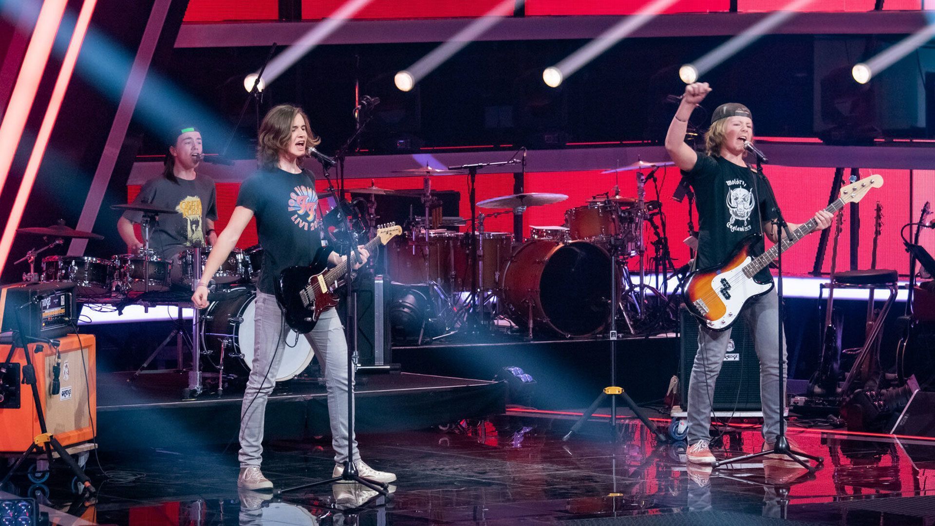 Sie sind Batteries of Rock und wollen als Band ihr Können unter Beweis stellen. Mit dem Klassiker „Blitzkrieg Bop“ von Ramones rocken sie das komplette „The Voice Kids“-Studio. Die Coaches toben und belohnen den wahnsinnigen Auftritt mit einem Vierer-Buzzer!