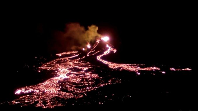 Auf Aufnahmen des TV-Senders RUV war ein helles Licht zu sehen, das gegen Mitternacht (Ortszeit, 02.00 MESZ) an der Felsspalte aufblitzte. Dann strömte Lava in kleinen Schüben aus dem Boden und Rauch stieg auf. Die leuchtend orangefarbene Lava floss den Hang hinunter und verteilte sich in einem Lavafeld am Fuß des Vulkans, das jetzt mehr als 33 Hektar misst, wie die isländische Meteorologiebehörde mitteilte.