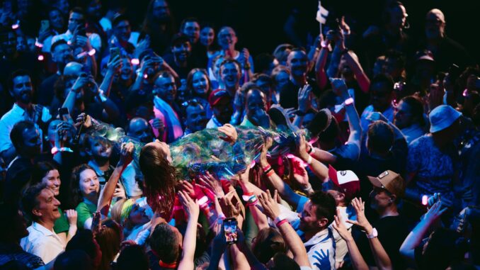 In ihrem typischen trockenen Humor kündigte Hazel Brugger an, sie wolle das Publikum mal aus nächster Nähe kennenlernen – und sprang kurz darauf mitten ins Publikum. Auf Händen getragen von den Fans, ließ sie sich durch die Menge treiben. Ihr Mikrofon glänzte im Scheinwerferlicht, während sie spontane Mini-Interviews führte und mit ihren frechen Kommentaren für viele Lacher sorgte. Der Stage-Dive war ein Novum beim ESC – und zeigte, wie sehr Brugger es versteht, die Grenzen zwischen Showbühne und Publikum aufzulösen.